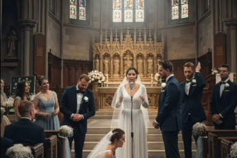 La iglesia era sobrecogedora, un santuario de perfección fabricada. Rosas blancas caían en cascada desde
