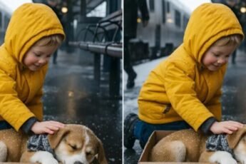 En el andén nevado, el niño vio de repente a un pequeño cachorro acurrucado en una caja de cartón, como