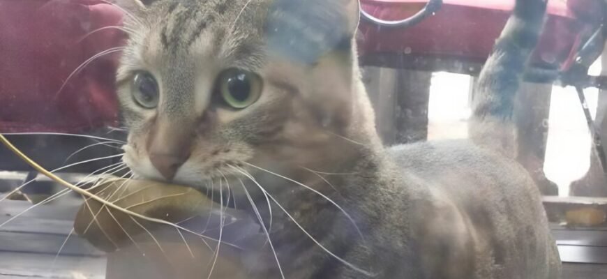 Cada mañana, el gato llega a nuestra pequeña tienda de  pescado. Gris, callejero, pero con unos ojos inteligentes — como si entendiera todo. Sostiene una hoja entre los dientes y se sienta frente al mostrador, esperando que lo note.