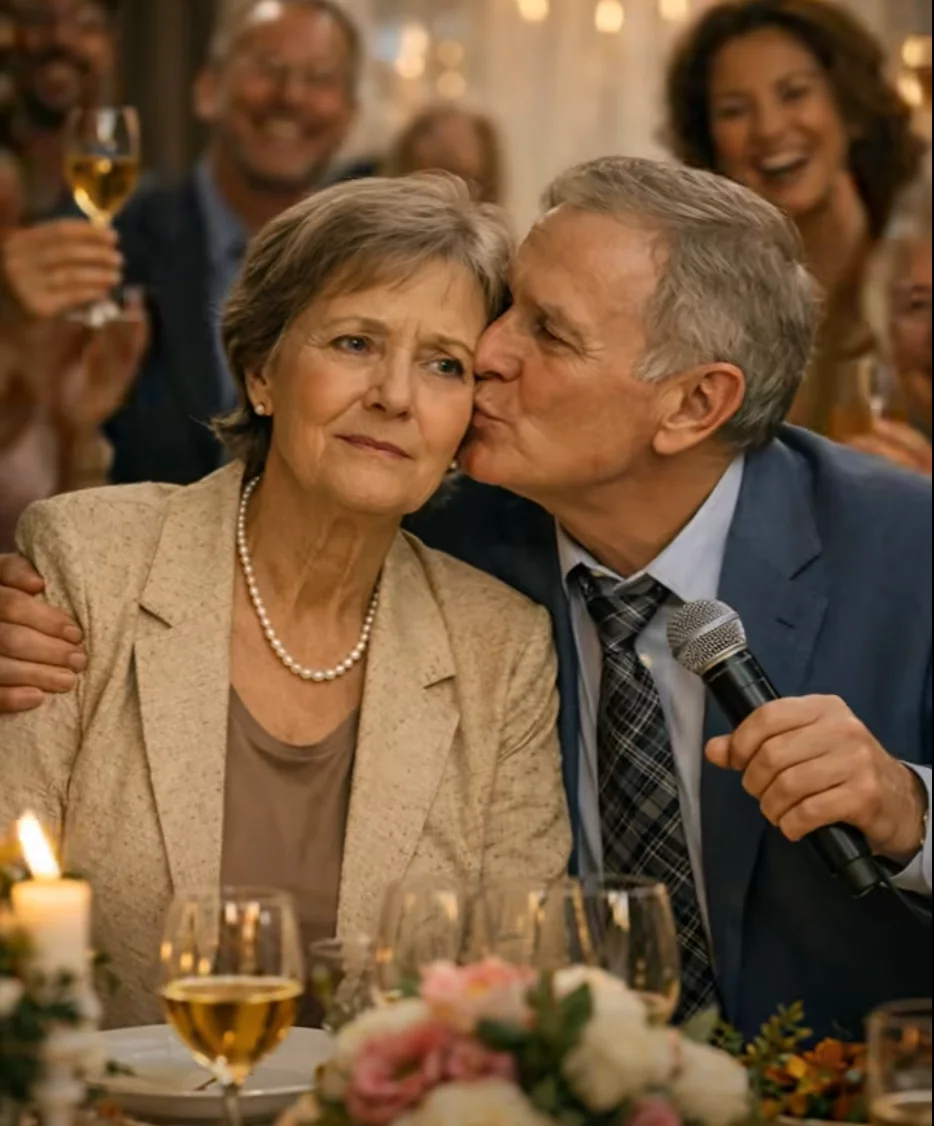 El marido sostenía el micrófono con seguridad, como si hubiera estado esperando ese momento toda la noche.