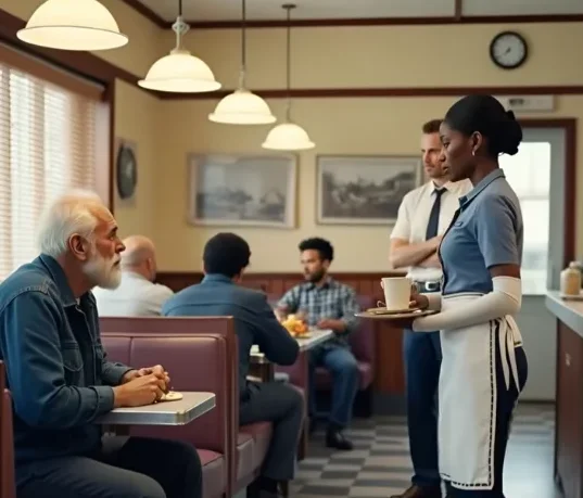 El aire estaba impregnado con el olor persistente de café quemado y tocino frito, una fragancia que parecía haberse absorbido en las paredes del lugar. En medio de ese caos, Denise se movía cargando bandejas solo con un brazo; el otro, inmovilizado por una fractura, sufría en silencio. Cada movimiento de su mano izquierda le arrancaba un gesto de dolor, pero aún así forzaba una sonrisa, sirviendo cafés humeantes y platos como si todo estuviera bien.