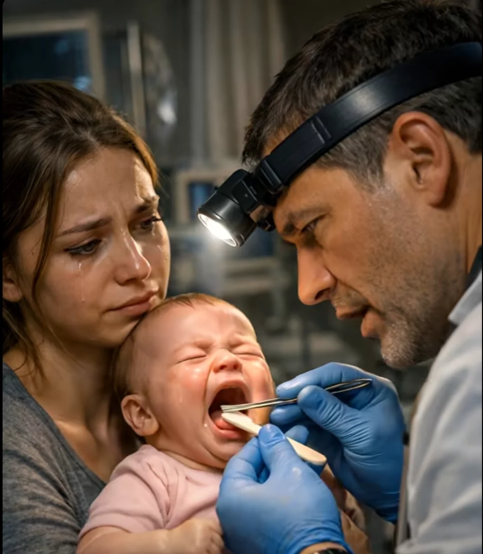 El médico entró. Con calma, se puso los guantes, encendió su lámpara frontal y le pidió que sostuviera al niño con más firmeza. La luz iluminó directamente el interior de la boca. El doctor bajó suavemente la lengua con un bajalenguas y observó con atención. Su rostro se volvió serio, y la madre apenas podía mantenerse en pie.