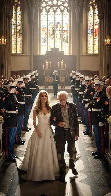 En mi boda, los invitados se burlaban del hombre sin hogar que invité. “¿Qué hace aquí?” susurraban. Justo en ese momento, llegó un convoy de SUV negros. Doce marines bajaron, caminaron directamente hacia él, y su capitán reveló un secreto sobre su pasado que hizo que cada invitado bajara la mirada, avergonzado…