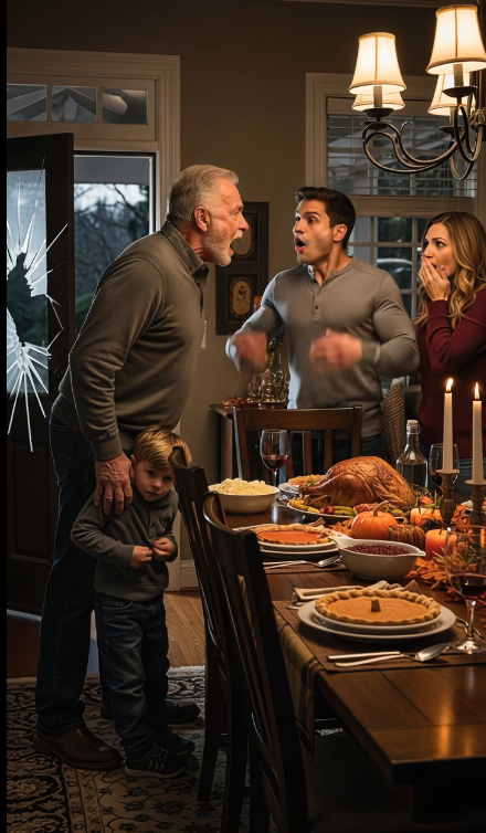 El aire cálido salió disparado, trayendo el olor de pavo asado y el sonido de un silencio atónito. Entré en el vestíbulo, Amos detrás de mí, y contemplé la escena: la mesa puesta como de revista, Wilbur en la cabecera con un cuchillo de trinchar en la mano, Leona a su lado, el cabello impecable. Frente a ellos, la hija de Wilbur con el tenedor a medio camino de la boca. Todo congelado.