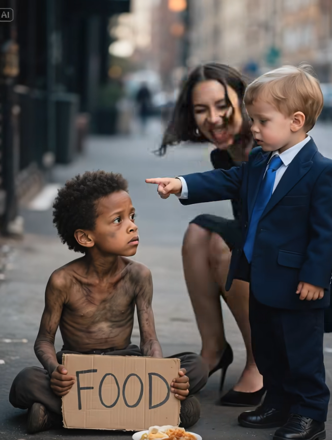 Pero Andrew no respondió. Sus ojos estaban fijos en una figura encogida junto a un contenedor: un niño de unos ocho años, descalzo y sin camisa, con un trozo de cartón entre las manos que decía simplemente: “¡Comida!”