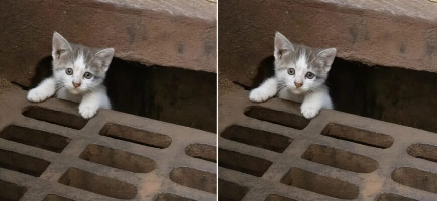 Me detuve — y me quedé paralizada. De un agujero oscuro asomaba un diminuto gatito, sujetándose con sus patitas al borde, como si suplicara ayuda. Sus ojos brillaban, llenos de miedo y esperanza.