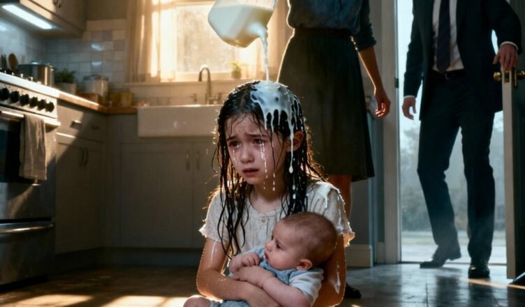 Emily était accroupie sur le carrelage, du lait coulant dans ses cheveux, sa robe trempée, des flaques s’étendant autour de ses genoux. Elle serrait Alex contre sa poitrine, le petit visage enfoui dans son épaule. Debout au-dessus d’eux, le visage tordu par la colère, se tenait Vanessa — tenant le bidon de lait vide comme une arme.