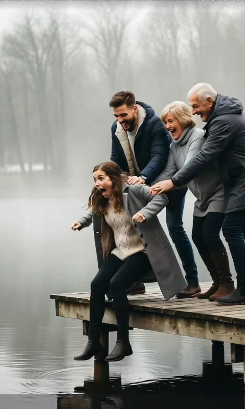 Pero ya no me escuchaban. La sujetaron por los brazos. Ella soltó un jadeo de sorpresa, más por el choque que por miedo. Todavía pensaba que era un juego. “¡Preston, no! ¡Papá! ¡Suéltenme!” tartamudeó, intentando zafarse, pero su risa nerviosa apenas se transformó en un tímido sonido. No quería arruinar el ambiente ni parecer débil.