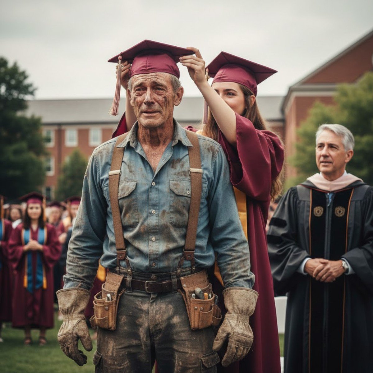 El auditorio quedó en absoluto silencio. Todos —académicos, estudiantes y asistentes— dirigieron la mirada hacia el albañil cansado pero orgulloso que había criado a un doctor sin pedir nada a cambio.