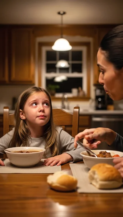 Por la noche, preparé un guiso de carne, la receta de mamá, pensando en darle consuelo. La mesa estaba lista, el olor llenaba la casa. Pero Sophia se sentó derecha, manos en las rodillas, sin mover un músculo.