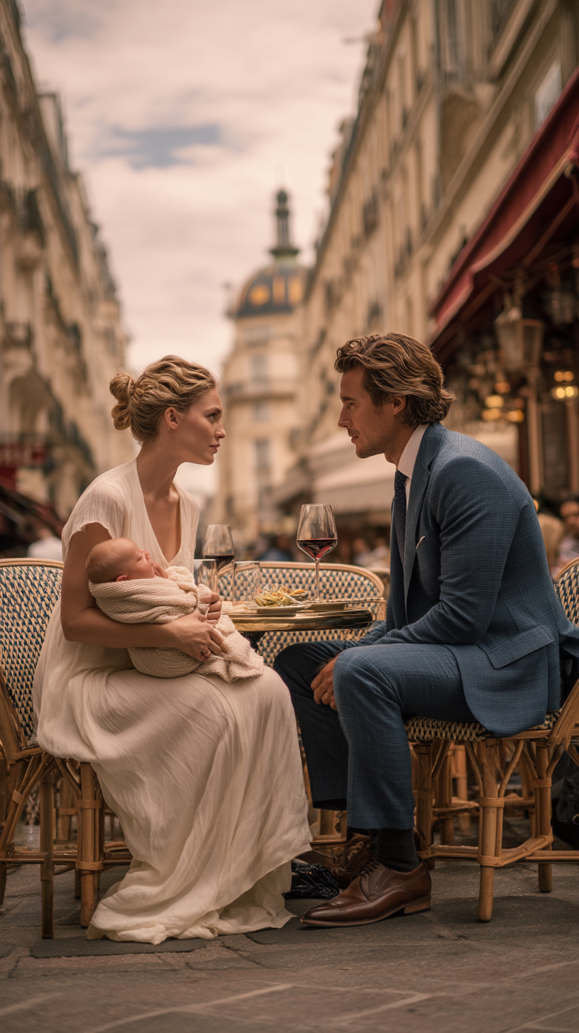 “Se arrodilló junto a su mesa en la acera, acunando a su bebé. “Por favor, no quiero tu dinero—solo un momento de tu tiempo.” El hombre de traje levantó la vista de su vino, sin saber que sus palabras romperían todo lo que él pensaba saber.