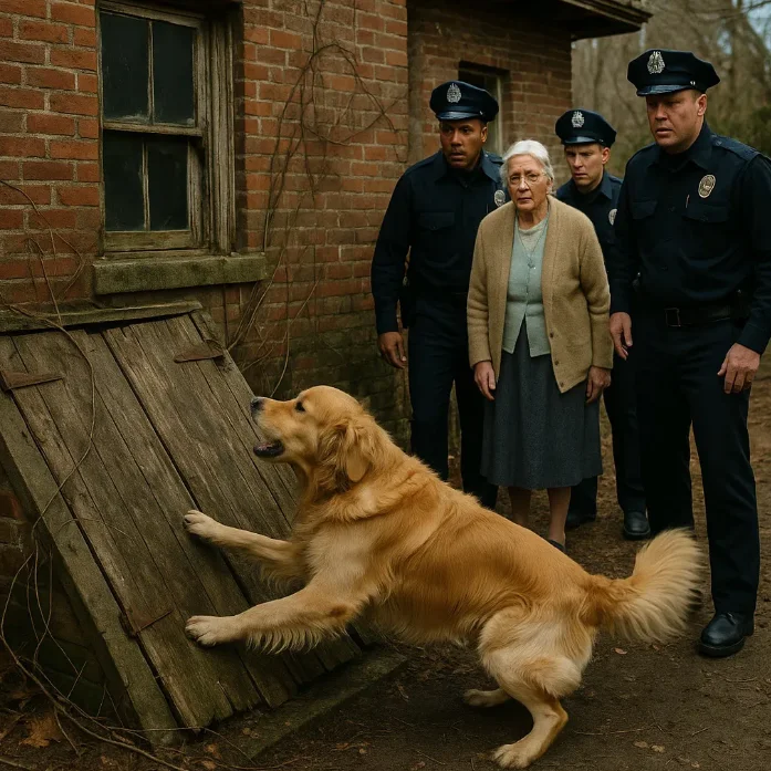 Los oficiales empujaron con cuidado la vieja reja chirriante. Sunny salió disparado, con el hocico pegado al suelo, olfateando con entusiasmo. Corrió directamente hacia la parte trasera de la casa y comenzó a arañar una puerta de sótano medio escondida bajo el porche. Su cola se agitaba como una bandera.