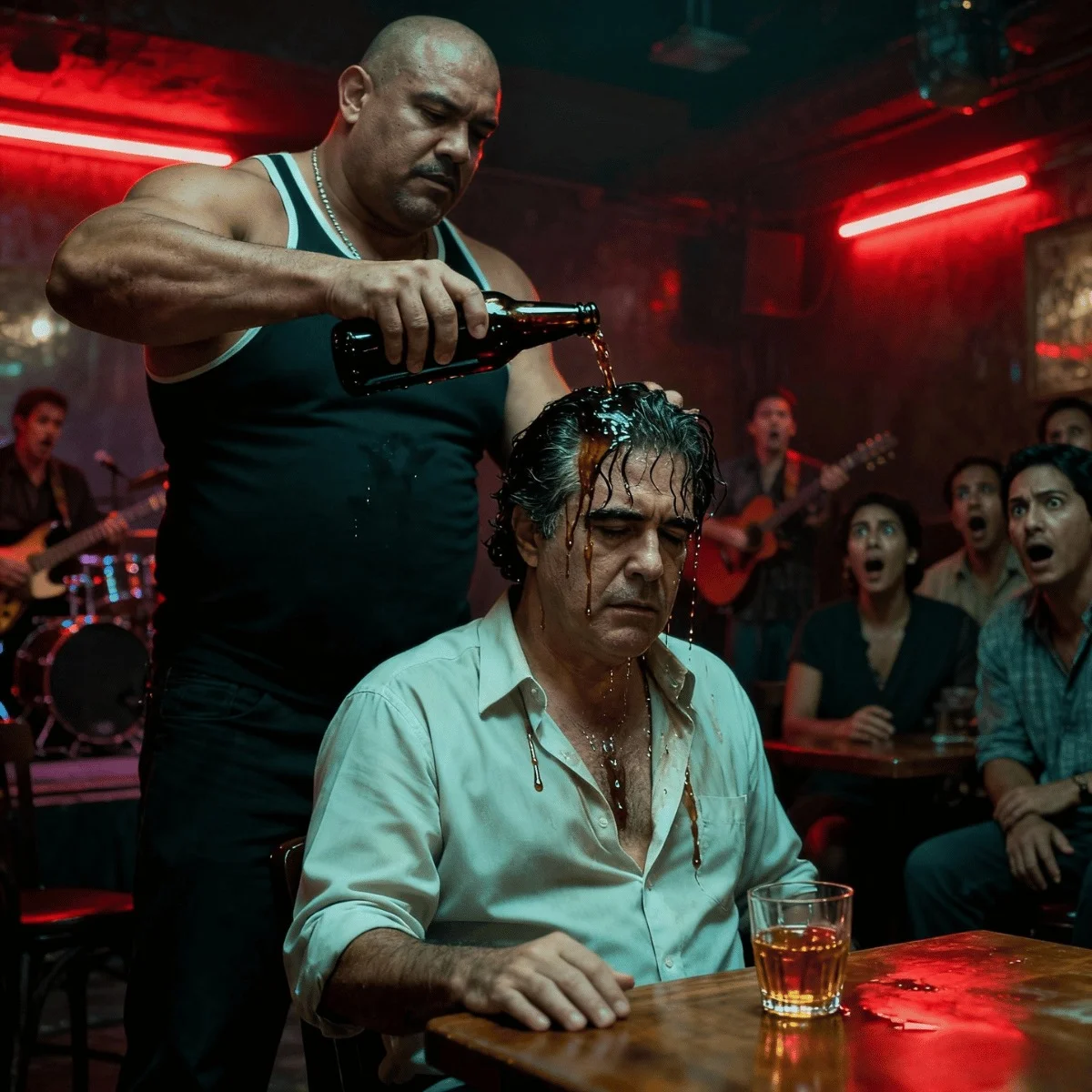 Los guardaespaldas de Pablo notaron el movimiento, pero una señal discreta de su jefe les indicó que no intervinieran todavía. Pablo quería ver hasta dónde llegaría la situación. Rodrigo llegó hasta la mesa y, sin decir una sola palabra, inclinó deliberadamente la botella sobre la cabeza de Pablo. El líquido dorado escurrió por su cabello negro, empapando su camisa blanca, mientras un silencio sepulcral caía sobre el bar.