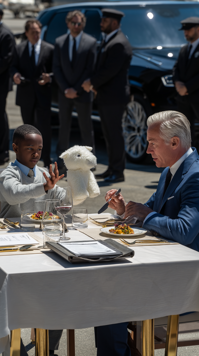 A solo unos pocos pies de su mesa, estaba un niño joven, de apenas ocho años, con la ropa rasgada, sosteniendo un osito de peluche gastado. Sus ojos estaban abiertos de par en par, llenos de pánico. Parecía que no había comido en días.