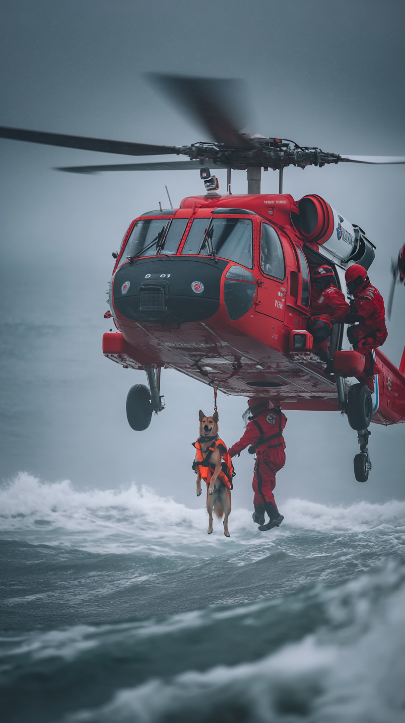 Un enorme perro blanco y negro, con un chaleco de rescate neón, de pie firme al borde de la puerta del helicóptero abierta como si lo hubiera hecho un millón de veces. La tripulación gritaba sobre los rotores, señalando hacia el lago.