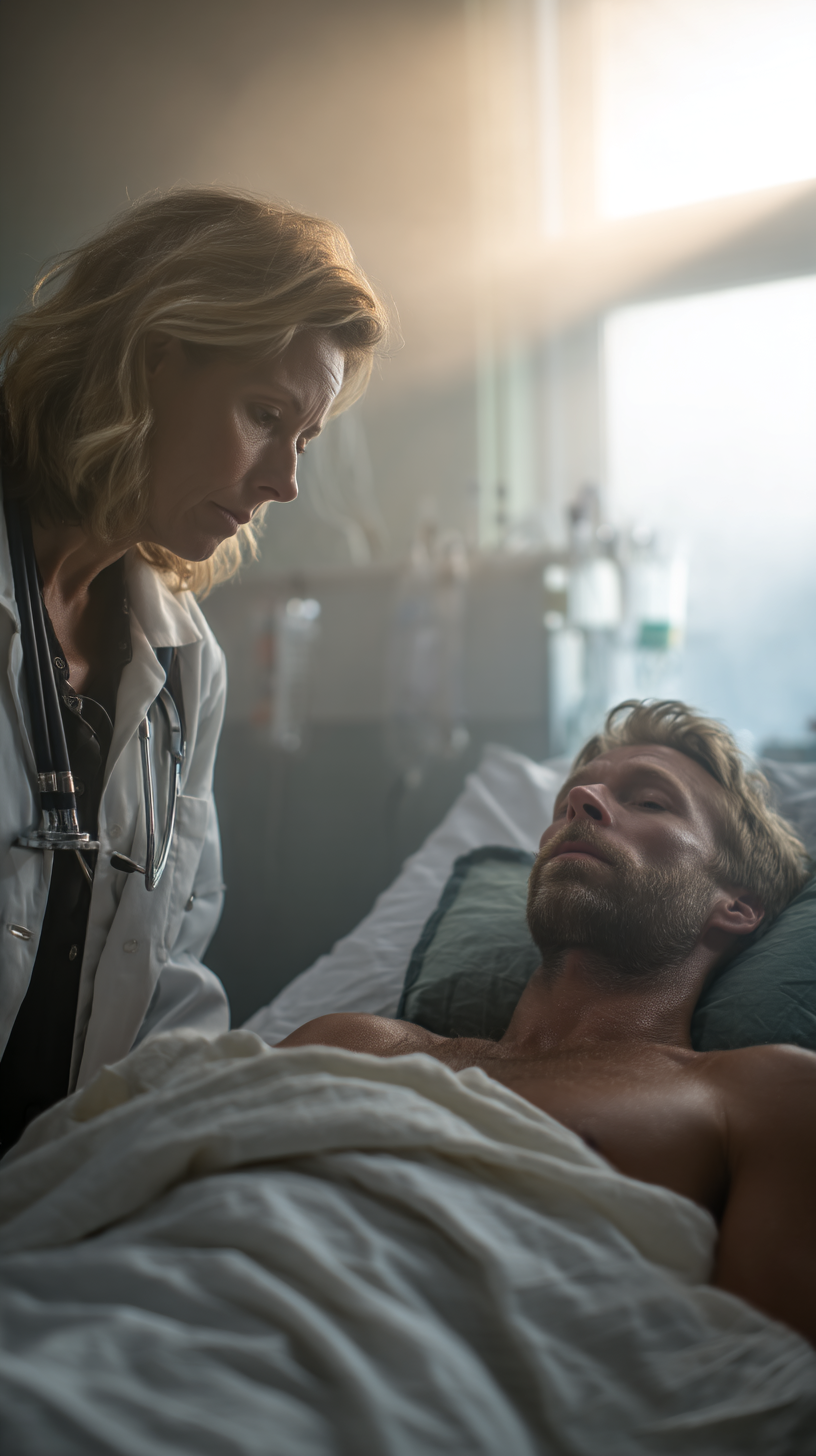 Una mandíbula fuerte, pestañas oscuras sobre su piel pálida, hombros anchos visibles bajo la bata hospitalaria. Si no fuera por la inmovilidad, fácilmente podría haber parecido un hombre simplemente durmiendo. Pero esto no era un sueño ordinario…